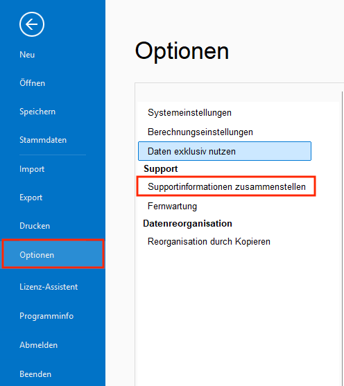 Unter Optionen finden Sie den Punkt [Supportinformationen zusammenstellen].